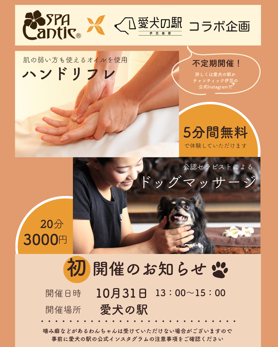 グループ店舗のホテルに併設するエステサロン「チャンティック」とのコラボ企画♪公認セラピストによるドッグマッサージ(20分3000円)エステをプチ体験できる手のもみほぐしの同時開催(5分間無料)わんちゃんと一緒に日頃の疲れ […]